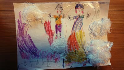 4歳の女の子なんですが、もう私が訪問させて頂いて、一年以上のお付き合いになります♪ しかも、次に私に会った時に渡したい!と、 少し前から用意してくれていたようなんですぅ ( ≧∀≦)ノ 白い毛糸が貼ってあるのは何かな?と思い、 聞いてみると、“雪”だそうで、外で雪遊びして 楽しかった様子を描いていました!