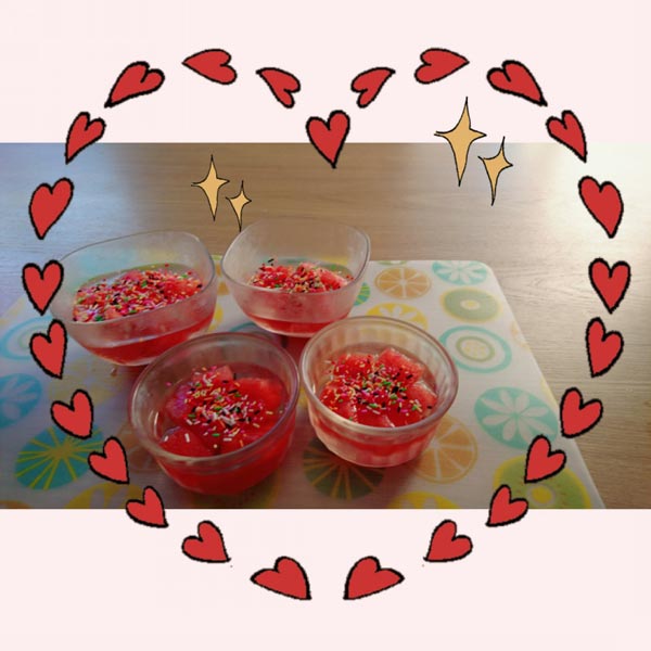 家に帰ったら、とっても美味しそうな“すいかゼリー”が冷蔵庫に入っててビックリしました!☆ 小4の娘が主にやったのだと思いますが、一生懸命作ってくれてた事に感動(。-_-。)♪