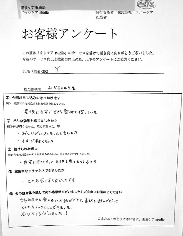 Y様からはアンケートご記入いただきました☆ ↓ ↓ ↓