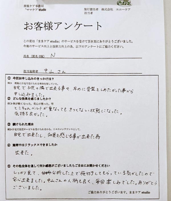 N様の施術は これまでで3回行かせて頂いています☆ ◎お客様アンケートです↓↓↓